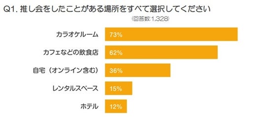 飲食を楽しみながら、歌ったり、映像を観たり!推し活仲間と集まる会「推し会」の会場として最も高い支持をあつめたのはカラオケルームで、73%が利用したことがあると回答!レンタルスペースもじわじわと人気が上がっています。