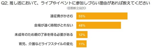 一方、「推し活」に欠かせないライブやイベントへの参加に関しては、75%もの方が悩みを抱えており、「遠征費がかさむ」、「会場が遠くて時間が取れない」と回答した方が、いずれも約半数に上りました。イベントの開催は大都市圏が多く、地方からの遠征にかかる金銭面や時間の負担を感じている方は少なくないようです。