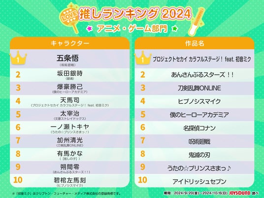 「推しランキング2024」 JOYSOUNDユーザーに今もっとも推されているアーティスト、キャラクターは!?