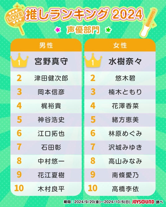 異性を推すケースが多い推し活において、男性だけでなく、女性からも厚い支持を獲得した水樹奈々が2年連続首位に!代表作に『魔法少女まどか☆マギカ』鹿目まどか役をもち、歌手活動も行う悠木碧が2位、『チェンソーマン』マキマ役のほか歌手としてソロメジャーデビューを果たした楠木ともりが3位にランクイン!