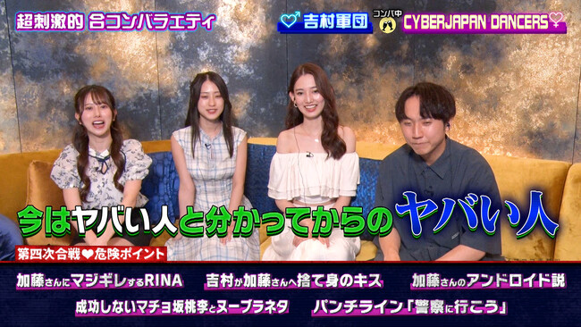吉村や同じチームのYUTARO(カントリーテール)は、合コンをかき乱す加藤さんを止めようとしますが、全く歯が立たず……。吉村が捨て身のキスで加藤さんの口を塞いだり、「警察に行こう」と促したりとあらゆる手を尽くしますが、すべて不発に! 破綻した合コンを見た西野は「改めてコンパってチームプレイなんやなって(思う)。一人ヤバい人いたら(成り立たない)」とこぼしました。