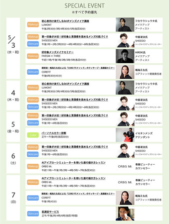 期間中、各分野のプロをスペシャルゲストに迎え、スキンケアやメイクアドバイスを体験できるイベントを日替わりで開催。メンズ美容初心者の方にもガイドとなる企画をご用意します。髪型や眉、肌の状態など、印象を大きく変える身なり。お客さまお一人お一人に合わせた、『今日から始める身だしなみ習慣』のスタートをお手伝いします。