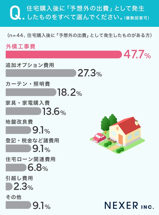 続いて、住宅購入後に「予想外の出費」として発生したものがあったかどうかも聞いてみました。