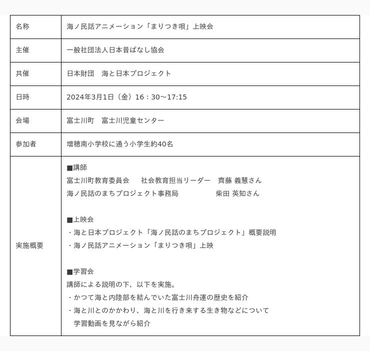 一般社団法人日本昔ばなし協会と日本財団が取り組む「海ノ民話のまちプロジェクト」は、2024年3月1日(金)、山梨県富士川町にて富士川町を舞台に制作したアニメーション「まりつき唄」の上映会と学習会を開催いたしました。