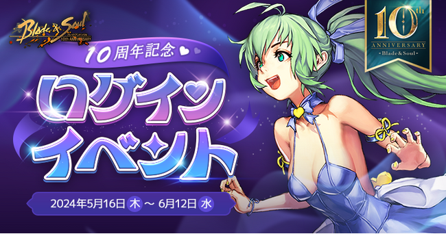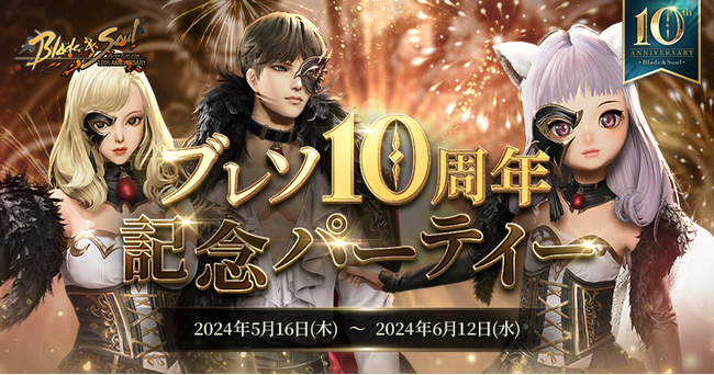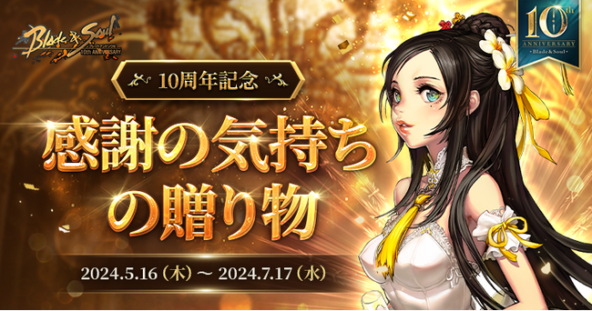PC向けオンラインゲーム『ブレイドアンドソウル(以下ブレソ)』をサービスしているエヌ・シー・ジャパン株式会社(本社:東京都港区、代表取締役会長:金 澤憲(キム テクホン)、代表取締役社長:林 元基(イム ウォンキ)、以下エヌシージャパン)は、2024年5月16日(木)より、正式サービス10周年を記念した各種イベントやキャンペーンの開催、および公式生放送の放送決定をお知らせします。