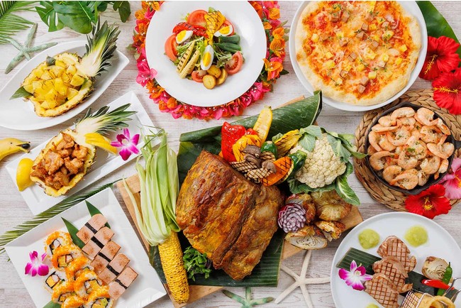ハワイをイメージしたレストラン ブッフェダイニング「アーカラ」では、自然豊かなハワイのローカルフードや伝統料理が勢ぞろい。店内は南国をイメージした装飾に包まれ、“リゾート気分”で楽しめるブッフェです。