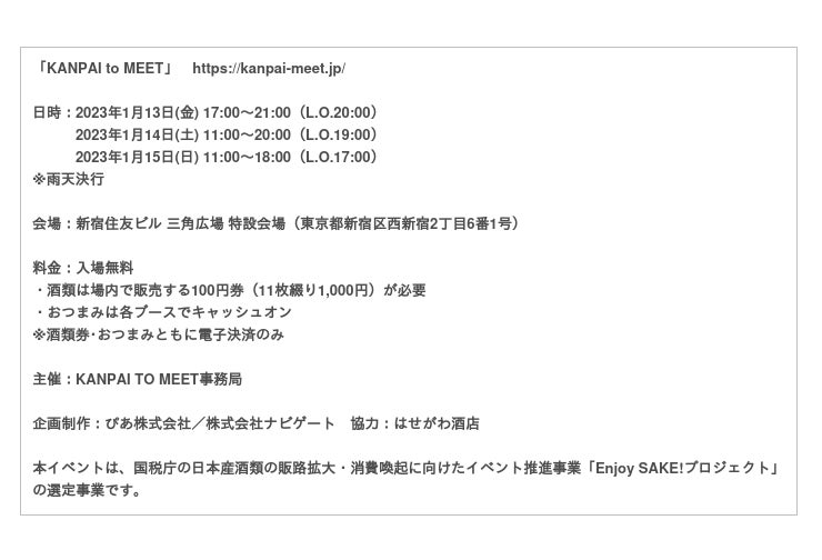 ぴあ株式会社は、国税庁が日本産酒類の消費喚起・販路拡大を目的として実施している「Enioy SAKE!プロジェクト」の選定事業として、この度、2023年1月13日(金)~15日(日)、東京・新宿住友ビル 三角広場にて、“日本最高のお酒”と“東京最高のレストラン”が集結するイベント「KANPAI to MEET」を開催致します。
