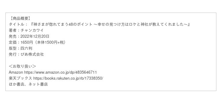 チャンがこれまで心がけてきたこと、コンプレックスとの向き合い方、物事がうまくいかないときの考え方など、大好きな神社めぐりを通じてわかった“神さまと仲良くする方法”について、包み隠さず語り尽くした1冊。チャンの周りの人たちが感じるチャンの“幸せポイント”、チャンがオススメする神社情報なども掲載。チャンからの幸せのおすそ分けがたっぷり詰まっています。