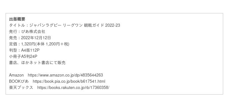 12月12日にぴあ株式会社より、『ジャパンラグビー リーグワン 観戦ガイド 2022-23』を発売いたします。