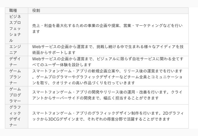 デジタルマーケティング事業(メディア・ソリューション事業、D2C事業)においては「ビジネスプロフェッショナル」「エンジニア」「デザイナー」の3職種、エンターテインメント事業では「ゲームプランナー」「ゲームプログラマー」「グラフィックデザイナー」の3職種、全6職種です。