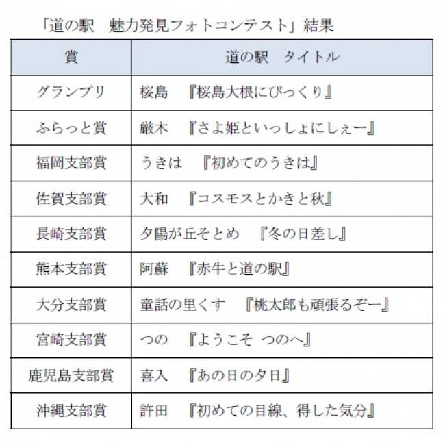 一般社団法人 日本自動車連盟(JAF)九州本部(本部長 金野 誠)は「道の駅 魅力発見フォトコンテスト」を開催し、投票結果を公表しました(共催:株式会社チームふらっと)。