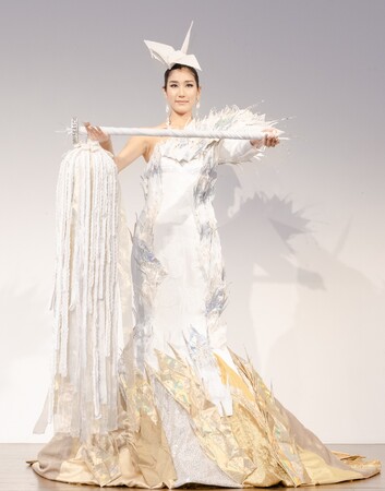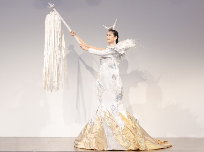 330羽以上の折り鶴を使ったドレスを身に纏い、2,200羽以上の折り鶴を使った錫杖(しゃくじょう)を手に登場した坂本は「不安定な世界情勢の中、平和のシンボルである鶴をモチーフにすることによって日本人が伝えられる平和の祈りを世界中の多くの人に届けられるのではないかと思います」とコメント。「この衣装を通して平和について考え直していただけるようなきっかけ作りができたら」と抱負を語りました。