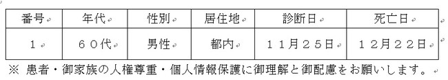 2021-12-22 東京都 新型コロナウイルスに関連した患者の死亡について Tweet ~新型コロナウイルス感染症に関する東京都からのお知らせ~ 都内で新型コロナウイルスに感染した方が死亡されましたのでお知らせします。 お亡くなりになった方のご冥福をお祈り申し上げます。 企業プレスリリース詳細へ PR TIMESトップへ 公式ツイッター Follow @Straightpress 最新情報をTwitterで受け取ろう! 公式フェイスブックページ 最新情報をFacebookで受け取ろう! 前の記事 一覧へ戻る 次の記事