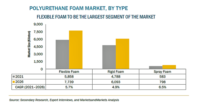 ポリウレタンフォームの市場規模は、2021年の428億米ドルからCAGR7.5%で成長し、2026年には615億米ドルに達すると予測されています。ポリウレタンフォーム市場が成長する主な理由としては、インドやタイなどの新興国で、寝具・家具、電子機器、自動車、建築・建設などのエンドユース産業が成長していることが挙げられます。また、省エネルギーを目的とした建築物の断熱材としてポリウレタンフォームの使用が増加していることや、ポリウレタンフォームのユニークな物理的特性が市場の成長の要因となっています。
