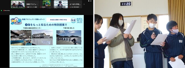 今回は、みんなで海の問題について考える「陸養プロジェクト 交流会」を2024年3月6日(水)にオンラインで開催しました。陸養プロジェクトを通して学んだ海の恵みや水産業のこと、自分たちで自主的に調べたこと等について発表、交流しました。交流会に参加したのは、東京都渋谷区立西原小学校、大阪府堺市立東百舌鳥小学校、愛知県蒲郡市塩津小学校、富山県魚津市立よつば小学校 の4校です。