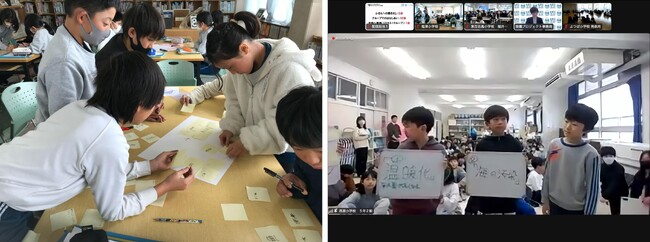 次に、海の問題についてみんなで考えるグループワークを行いました。はじめに各学校のクラス内グループで「『海』と聞いて思いつく問題とその理由」を、ふせんに書き出しながら話し合いました。そして最後に、各クラスを代表してその内容を発表し、交流会に参加したみんなで共有しました。「地球温暖化」や「海洋ごみによる汚染」、「魚の獲りすぎ、減少」、「マイクロプラスチック」など、多くの問題があることを確認し、「自分たちの生活に欠かせない水産業に影響が出るから」、「大切な命である魚が暮らせる環境ではなくなってしまうから」などの理由を教えてくれました。離れた地域に住む小学生同士、オンラインの短い時間でしたが、このプロジェクトを通して学んだことや感じたことを共有できる貴重な機会となりました。この時の気持ちを忘れずに、大人になって海や魚について触れた時に思い出してもらえることを願っています。