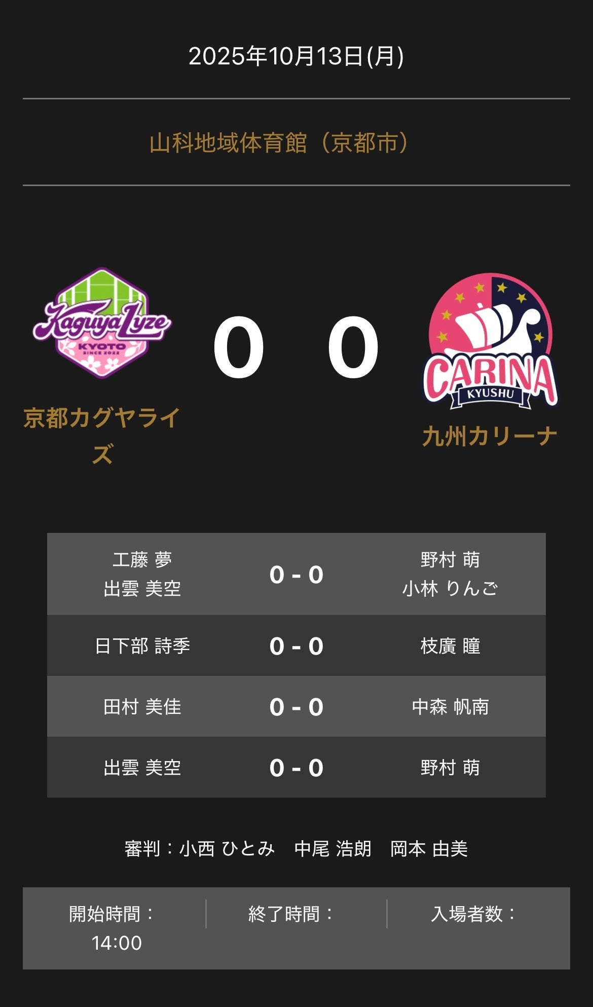 ノジマTリーグ 2025-2026シーズン 公式戦 10月13日開催 「京都カグヤライズ vs 九州カリーナ」の対戦オーダーを発表いたします。