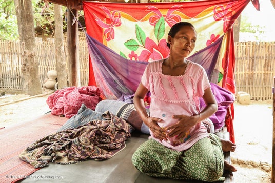 出産を控えた39歳のこの女性は、ネピドーで被災し、ユニセフから新生児用キットなどの支援物資を受け取った(ミャンマー、2025年4月12日撮影) (C) UNICEF/UNI784854/Maung Nyan