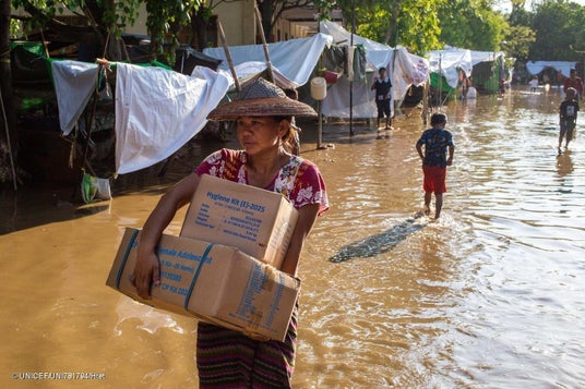 マンダレーの仮設キャンプで、ユニセフから受け取った支援物資を抱えて歩く女性。大雨の影響で、キャンプ内は浸水している(ミャンマー、2025年4月16日撮影) (C) UNICEF/UNI781794/Htet