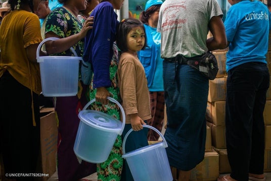 サガイン郡の仮設キャンプで、支援物資を受け取るための列に並ぶ女の子(ミャンマー、2025年4月8日撮影) (C) UNICEF/UNI779262/Htet