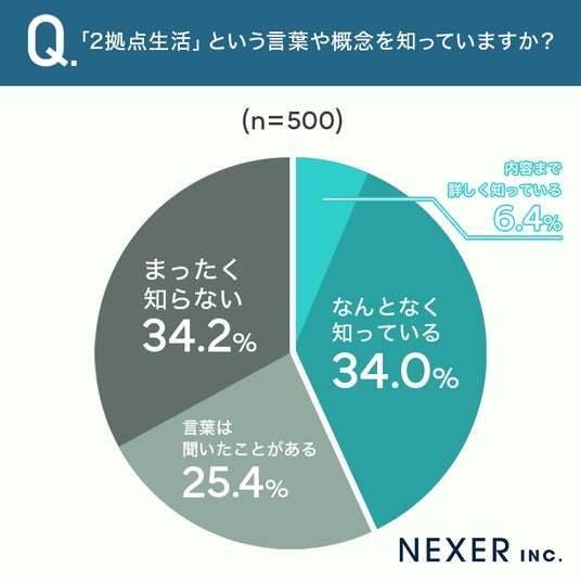 その結果「内容まで詳しく知っている」が6.4%、「なんとなく知っている」が34.0%、「言葉は聞いたことがある」が25.4%でした。これらを合わせると全体の65.8%が2拠点生活について何らかの認識を持っていることがわかります。