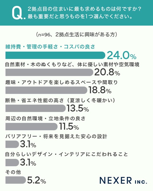 コスパを最重視する人が多い背景には、2拠点生活という現実的な負担があることがわかります。一方で、自然素材やぬくもりのある空間を求める声が2位に入ったことから、もう一つの家を持つなら、普段の暮らしとは違う心地よさを手に入れたいという願望がうかがえます。