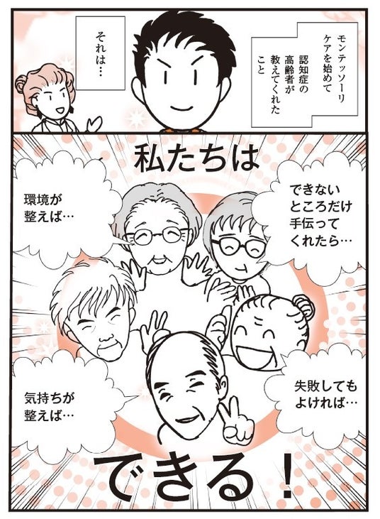 本書では「モンテッソーリ教育」のメソッドを「認知症ケア」として組み合わせた、独自の介護ケア「モンテッソーリケア」の基本と実例をマンガでわかりやすく紹介します。