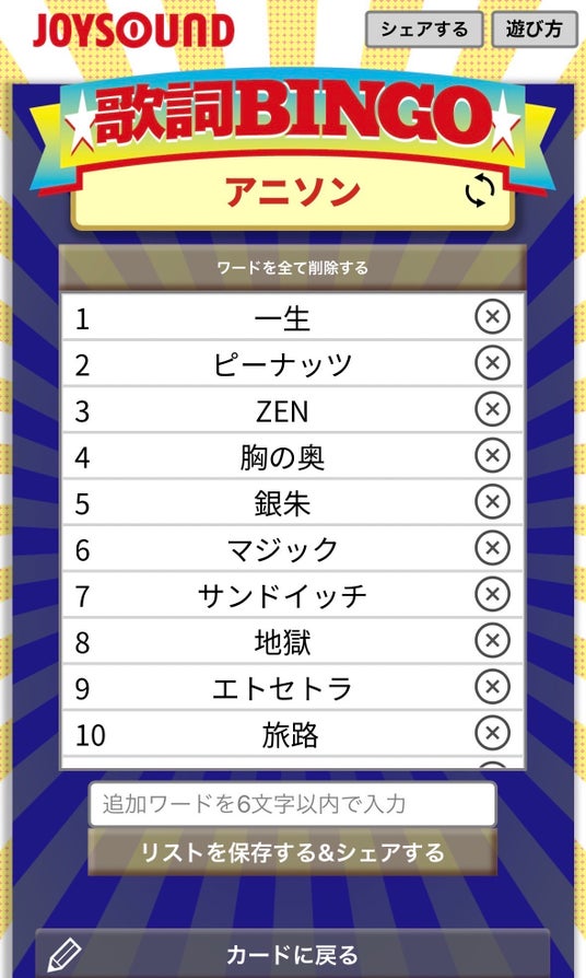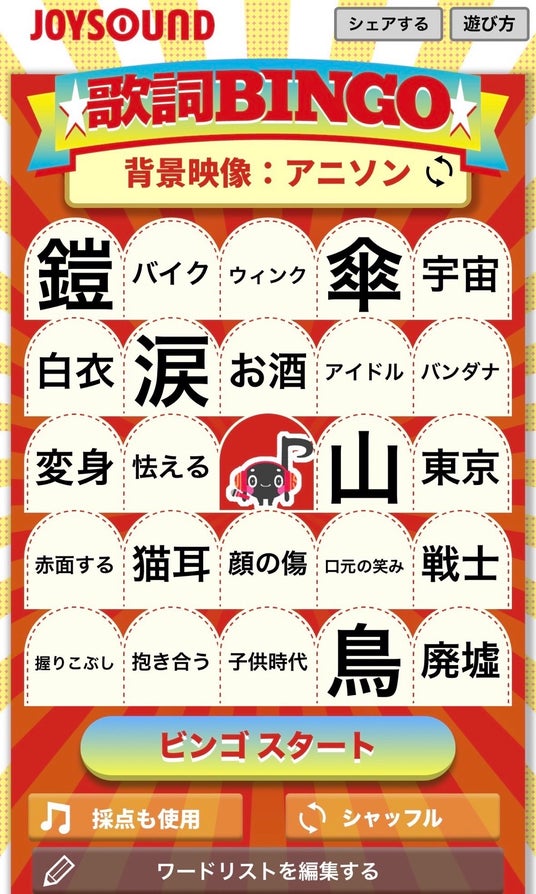 なお、スマートフォンがあれば気軽に遊べる「歌詞ビンゴ」のWEBアプリでは、2024年のヒット曲やアニメソングなど、お好みのテーマのビンゴカードを選んで遊ぶことができるほか、自身でワードをカスタマイズして、SNS等でシェアすることも可能です。