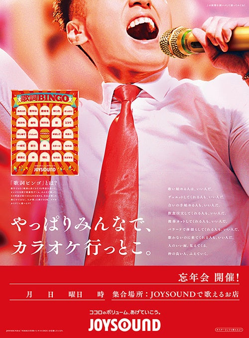 JOYSOUNDを展開する株式会社エクシング(本社:名古屋市瑞穂区、代表取締役社長:水谷 靖)は、「やっぱりみんなで、カラオケ行っとこ。」をキャッチフレーズに、忘年会におけるカラオケの利用促進を図るとともに、数字の代わりにカラオケで歌われる曲の「歌詞」でビンゴを目指すカラオケの新しい楽しみ方「歌詞ビンゴ」を提案する広告を12月3日(火)の日本経済新聞(朝刊)に掲載しました。また、スマートフォンがあれば、すぐに「歌詞ビンゴ」に挑戦できる無料のWEBアプリや、印刷用データを特設ページに公開しました。