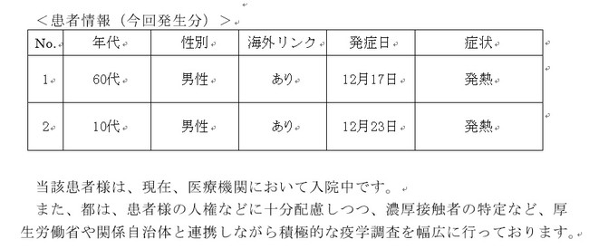 この度、東京都健康安全研究センターにおいて、変異株PCR検査でオミクロン株疑いが確認され、ゲノム解析を行った結果、下記のとおり、オミクロン株が判明したので、お知らせします。