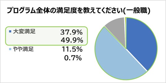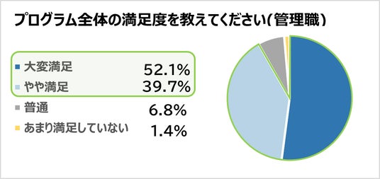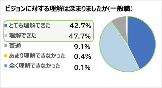 本プログラムの終了後、社員にアンケートを実施し、プログラムの満足度を調査したところ、社員の約9割(一般職87.8%、管理職:91.9%)が「大変満足」、「やや満足」と感じていることが分かりました。また、ビジョンに対する理解度については、約9割の一般社員が「とても理解できた」「理解できた」と回答し、今後の行動について明確になったかという質問に対しては、9割以上の管理職層社員が「とても明確になった」「明確になった」と回答しました。