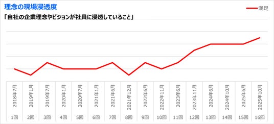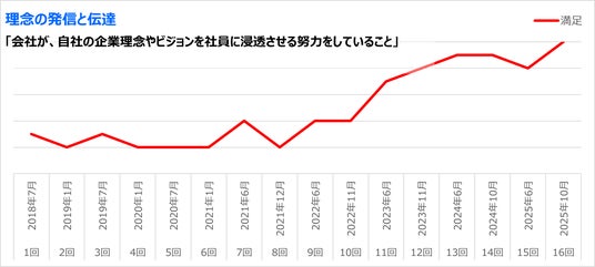 当社が2018年から年2回実施している組織診断では、全社横断型のビジョン浸透プログラムを開始した2022年8月以降、「会社が自社の企業理念やビジョンを社員に浸透させる努力をしていること」「自社の企業理念やビジョンが社員に浸透していること」という2つの項目の満足度で、どちらも大幅にポイントが向上しています。