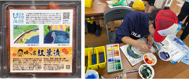 その体験学習の中で学びのまとめとして作成したポスターをパッケージに印刷したものが「『紅葉漬』俺っ家×海と日本プロジェクトin岩手 特別パッケージ」です。陸前高田市の飲食店「公友館俺っ家」と連携し、サケとイクラを醬油漬けにした「紅葉漬」を、参加した児童22人が制作したポスターを使用して全11種類のオリジナルパッケージとして販売しました。