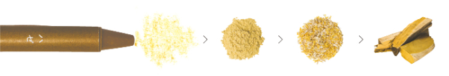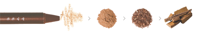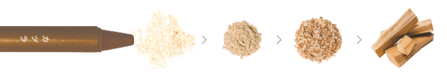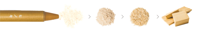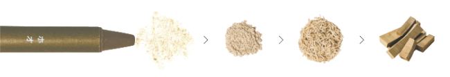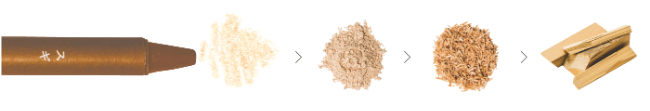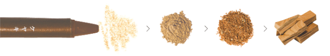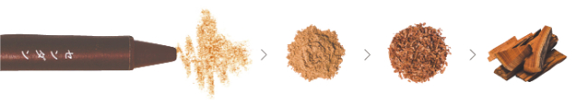 国土の約3分の2が森林の日本は、南北に長く、多種多様な樹々が生息しています。森で伐採した木は「土場」と呼ばれる集積所へ運ばれます。「森のクレヨン」は、通常ははじかれるゆがみや割れのある木を中心に、製材の際に出た切れ端、おがくずなどを原料に選んでいます。木の色は、樹種によってさまざまです。それぞれ工場で細かく粉砕してパウダー状にし、米ぬか由来のライスワックス、米油と混ぜ、型に流し込んで冷まします。