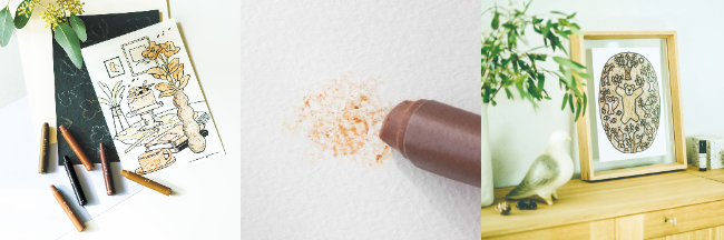 原料は木の粉とライスワックス、米油のみ。すべて純国産にこだわり、100%木の色だけ、着色料無添加のクレヨンです。10本の表情豊かな茶色のカラーパレットはもちろん、木の硬さによって異なる描き味も楽しめます。木製のインテリアになじむ自然な色合いです。