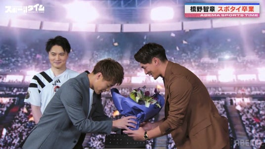 そして番組の最後には、メインコメンテーターを務める川崎宗則さんがリモートで出演。同じくスポタイファミリーのお笑いコンビ・コットンの西村真二さんと、タレントの影山優佳さんからもメッセージが贈られ、過去の放送を思い返した槙野さんは感慨深そうな表情に。監督業に専念するため、メインコメンテーターとしての番組出演が最後となる槙野さんは、「今はワクワクしてます。毎日携帯が鳴り止まないんですよ。来季の編成とか色々やってるので、とにかく電話が鳴り止まない!」と話しつつも、「寂しいです。ここにはいつも当たり前のように来て、たくさんお話ししてたんですけど…」と放送初回から出演してきた番組への思いを吐露。「皆さん、ぜひ静岡の藤枝に遊びに来てください!」と視聴者へ向けた力強いメッセージを口にした槙野さん。柿谷さんから花束が手渡され、槙野さんの新たな門出をお祝いしました。
