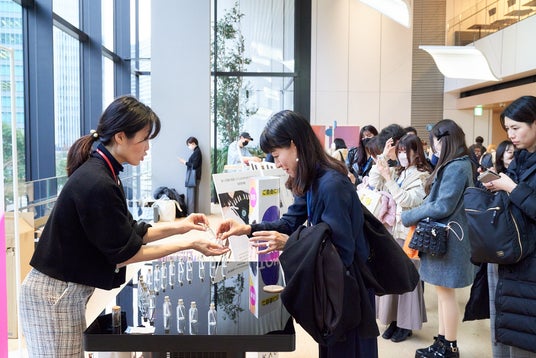 資生堂とSCENTMATIC(セントマティック)株式会社が開発した、「香りと言葉の変換をするAIシステム」KAORIUMの体験展示です。イベントでは、資生堂が開発した20種類の香りの中からKAORIUMを通じて自分の好きな香りと出会う体験や、KAORIUMの結果をもとに資生堂研究員と一緒にオリジナルアロマオーナメント(R)※2 を作成するワークショップを開催しました。