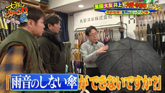 続いておっさんたちが訪れたのは「丸安洋傘株式会社」。ずらりと並ぶ傘は、どれも職人の手による上質な逸品ばかり。なかでも注目は、雨音がほとんどしないという「サイレントアンブレラ」。画期的な仕掛けは、業界に衝撃を与えたそう。