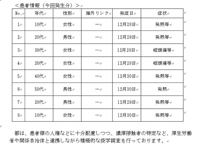 この度、東京都健康安全研究センターにおいて、変異株PCR検査でオミクロン株疑いが確認され、ゲノム解析を行った結果、下記のとおり、オミクロン株が判明したので、お知らせします。