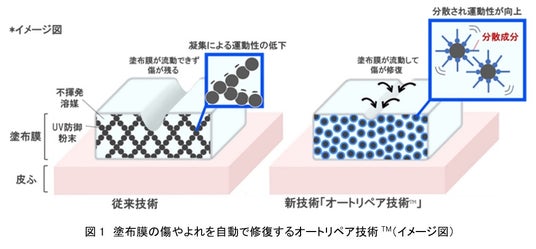 資生堂は、日焼け止めなどの紫外線(UV)防御機能をもつ塗布膜において、ミクロレベルの傷やよれを自動で修復する画期的な技術「オートリペア技術(TM)」の開発に成功しました。日焼け止めの塗布膜は、手指との接触による「傷」や、表情の動きなどによってできる「よれ」により、その部分の塗布膜が薄くなり、UV防御機能が低下することが分かっています。本技術は、当社独自成分を含む粉末分散剤の組み合わせを配合することにより、塗布膜が完全には固化せず適度な流動性をもつことで、塗布膜にできたミクロレベルの傷やよれを自動で修復します。これにより、手指との接触や表情の動きによるUV防御機能の低下を防ぐことが可能になりました。
