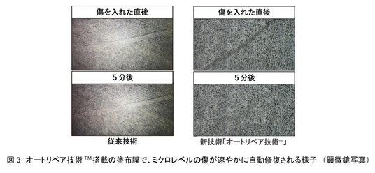 塗布膜の流動性を高めるためには通常、粉末の減量か不揮発溶媒の増量が必要ですが、手指への付着のしやすさや使用感のべたつきを招きます。この課題の解決に向けて、流動性の低下をもたらす粉末の凝集を改善する方法を検討しました。その結果、当社のこれまでのマテリアルサイエンス領域の知見をベースに最新の粉末分散研究の知見を取り入れることで、特定の粉末分散剤が塗布膜中の粉末の分散性を改善し、塗布膜が流動的になることを見出しミクロレベルの傷やよれを自動で修復させる新技術「オートリペア技術(TM)」の開発に成功しました(図2)。塗布膜の傷が自動で塞がる様子は、視覚的にも確認することができました(図3)。
