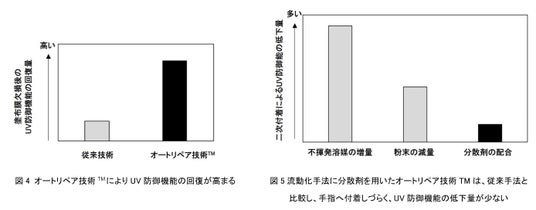 実際に、オートリペア技術(TM)を搭載した塗布膜において、UV防御機能の回復が高まるかを検証し、オートリペア技術(TM)によって流動化された塗布膜において、膜に傷をつけた5分後までにUV防御機能の回復を確認しました(図4)。また、従来の手法で流動化された塗布膜と比べて手指へ付着しづらく、UV防御機能の低下量が少ないことも確認できました(図5)。