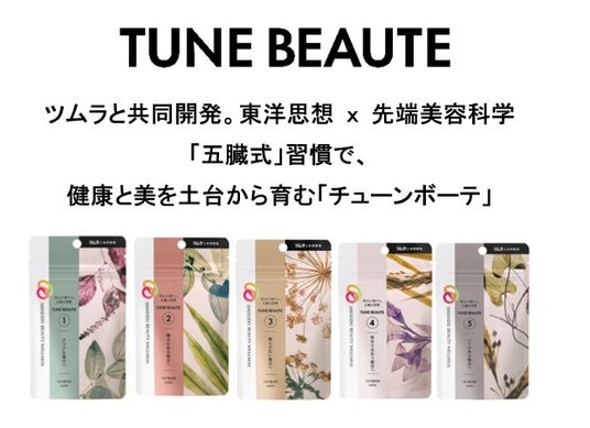 身体の中の声を聞き、本来持っている力や今の状態に合わせたアプローチで「美を育む、五臓式習慣」として、株式会社ツムラと共同開発をした商品ブランドです。「TUNE BEAUTE(チューンボーテ)」の名称は、「小さな歪みさえも微調整して、美しさの土台をつくりあげる調律師」をイメージし、「BEAUTE(美しさ)をTUNE(調律する)」の意味より考案しました。