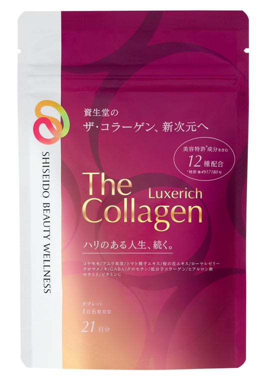 【商品特長】 12種の美容成分を贅沢配合。大人世代にうれしいローヤルゼリー、クロマメノキなどをプラス。6粒/1日目安に、ザ・コラーゲン リュクスリッチ<ドリンク>1本分と同じ種類・配合量の美容成分を凝縮。