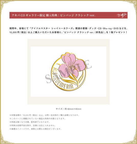 期間中、会場にて『アイドルマスター シャイニーカラーズ』関連の書籍・グッズ・CD・Blu-ray・DVDなどを10,000円(税込)以上ご購入いただいたお客様に、「ピンバッジ クラシックver.(非売品)」を1個プレゼント。