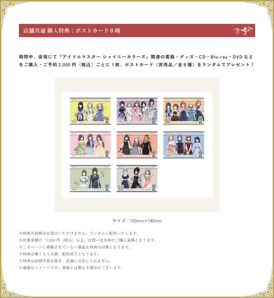 3.期間中、会場にて『アイドルマスター シャイニーカラーズ』関連の書籍・グッズ・CD・Blu-ray・DVDなどをご購入・ご予約2,000円(税込)ごとに1枚、「ポストカード(非売品/全8種)」をランダムでプレゼント。