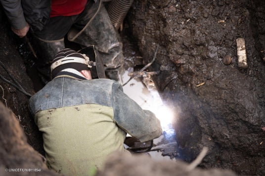 ドネツク州で、破損したパイプを修理する水道会社の作業員(ウクライナ、2025年3月18日撮影) (C) UNICEF/UNI811654/