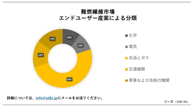 エンドユーザー産業に基づいて、石油とガス産業で働く労働者の生命に脅威をもたらすフラッシュ火災の増加により、石油とガス産業では難燃繊維の使用が増えています。この業界は、非常に可燃性の物質を扱うため、火災の危険性の点で最も危険な業界の 1 つです。石油とガスの生産、精製、輸送、および海洋掘削作業ではすべて、難燃繊維が大量に使用されています。たとえば、西ベンガル州のインド石油公社 (IOC) のハルディア製油所で 2021 年火曜日の午後に発生しました(フラッシュ ファイア)では、少なくとも 4 人の従業員が死亡し、約 43 人以上が負傷しました。