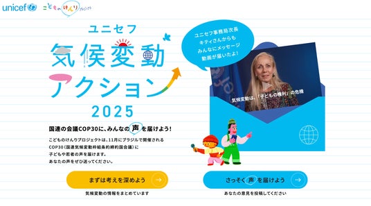 日本ユニセフ協会は、子どもや若者が気候変動を学び、考え、声を上げるためのプロジェクト「ユニセフ気候変動アクション2025」を開始しました。特設サイトでは、未来のために必要な気候変動対策について、子どもと若者たちの意見を募集しています。本サイトは気候変動問題を知るためのコンテンツも掲載しており、学生の皆さまの夏休みの自由研究や調べ学習においても、活用いただけます。
