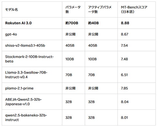 (注4)2025年12月18日時点の開示情報に基づく自社調べ。これまでに楽天で開発した「Rakuten AI 7B」は約70億パラメータ、「Rakuten AI 2.0」は約470億パラメータです。